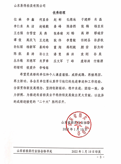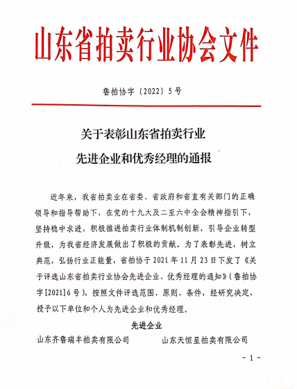 關(guān)于表彰山東省拍賣行業(yè)先進(jìn)企業(yè)和優(yōu)秀經(jīng)理的通報